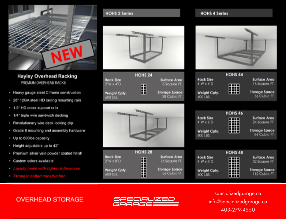 HD OverHead/Ceiling Racks turn unused ceiling space into an area for storage. Heavy duty storage racks installed from the ceiling make for instant and easy storage space. Organize and store seasonal items such as camping gear, coolers, winter tires, decorations and holiday lighting.
